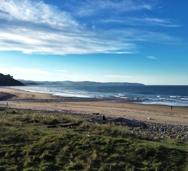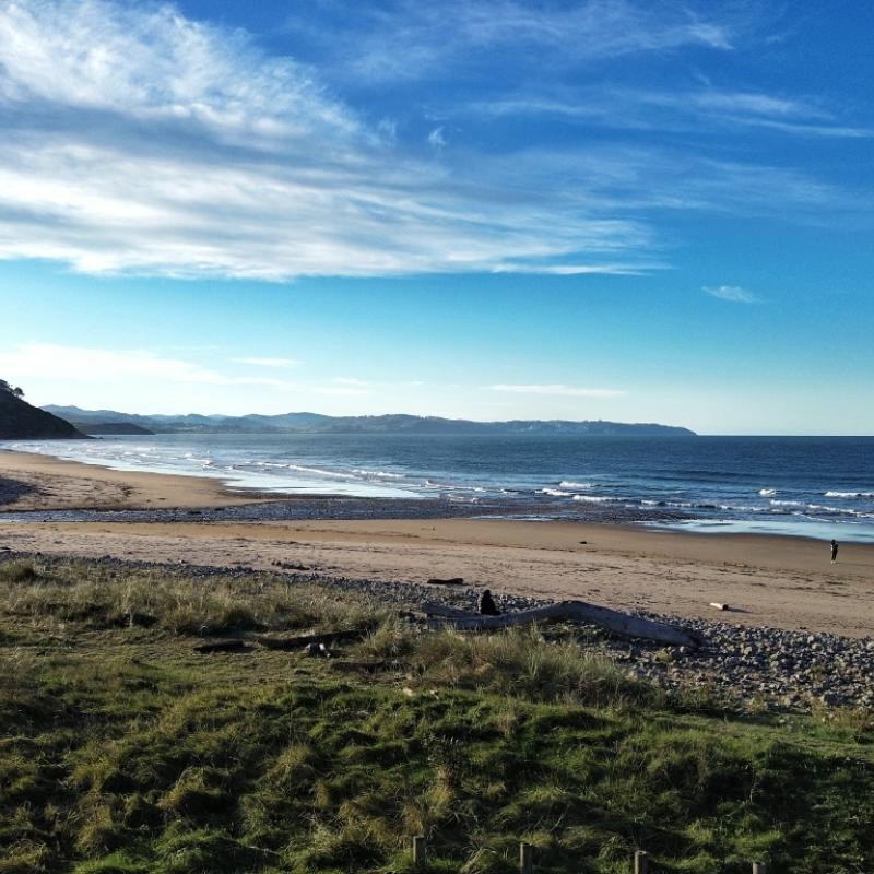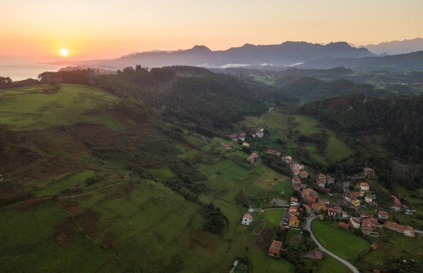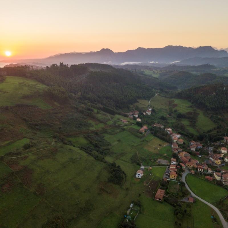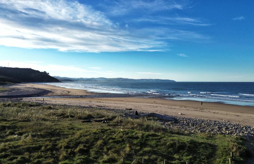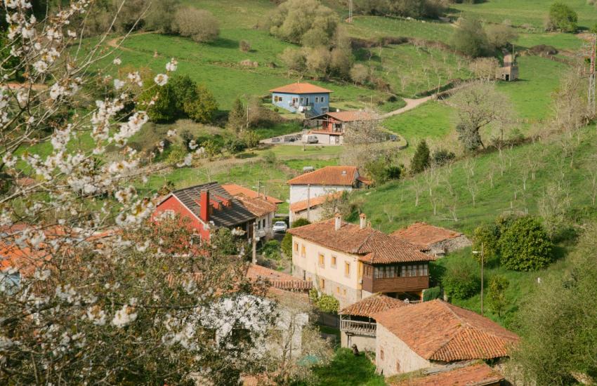 La ruta cruza el pueblo y sigue por carreteras locales entre fincas ganaderas hacia Abéu, donde se abandona el asfalto para coger una pista de tierra que en época de lluvias puede estar embarrada. Por ella se avanza hasta dar vista a la impresionante playa de Vega hacia donde desciende el sendero.