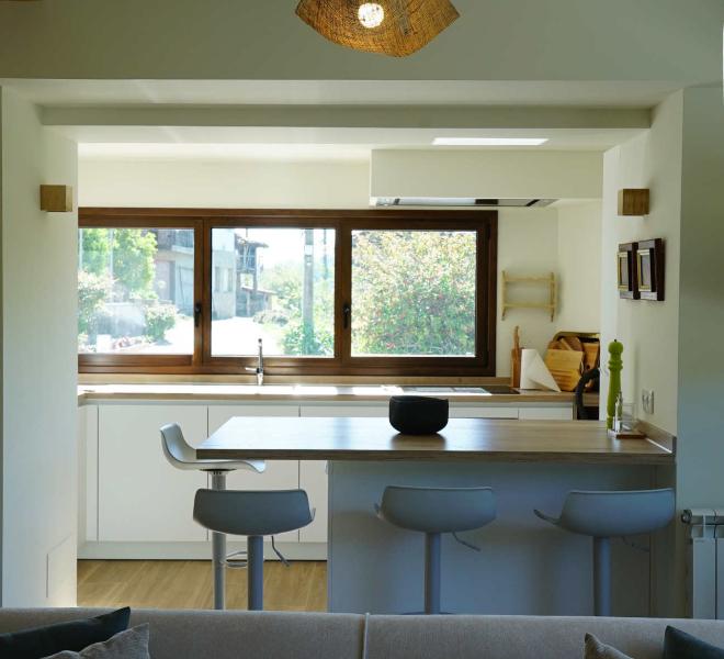 La casa 1: 3 habitaciones y dos baños completos en planta alta. Salón – comedor – cocina y un aseo en planta baja.