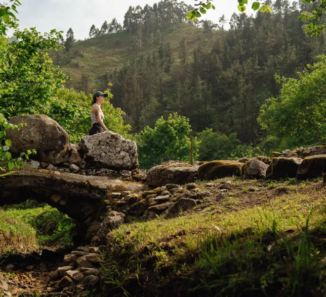 Comenzamos a andar desde la plaza, corriendo paralelos a la orilla izquierda del arroyo Santianes. Unos 250 metros más adelante, cruzaremos un puente de piedra, atravesando el cauce del arroyo para proseguir ahora por la margen derecha del mismo. Tras dejar atras la aldea, la pista entonces inicia una vertiginosa subida hacia el valle de Peme.
